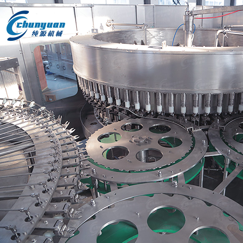 XGF系列三合一饮用水灌装机适用于聚脂瓶灌装各种纯净水、矿泉水、饮用水等生产。三合一饮用水设备集冲瓶、灌装、封盖三个功能于一体,全过程实现自动化。纯源机械厂家生产制造的水灌装设备设计科学合理,外形美观,功能齐全,操作维修简便,自动化程度高。