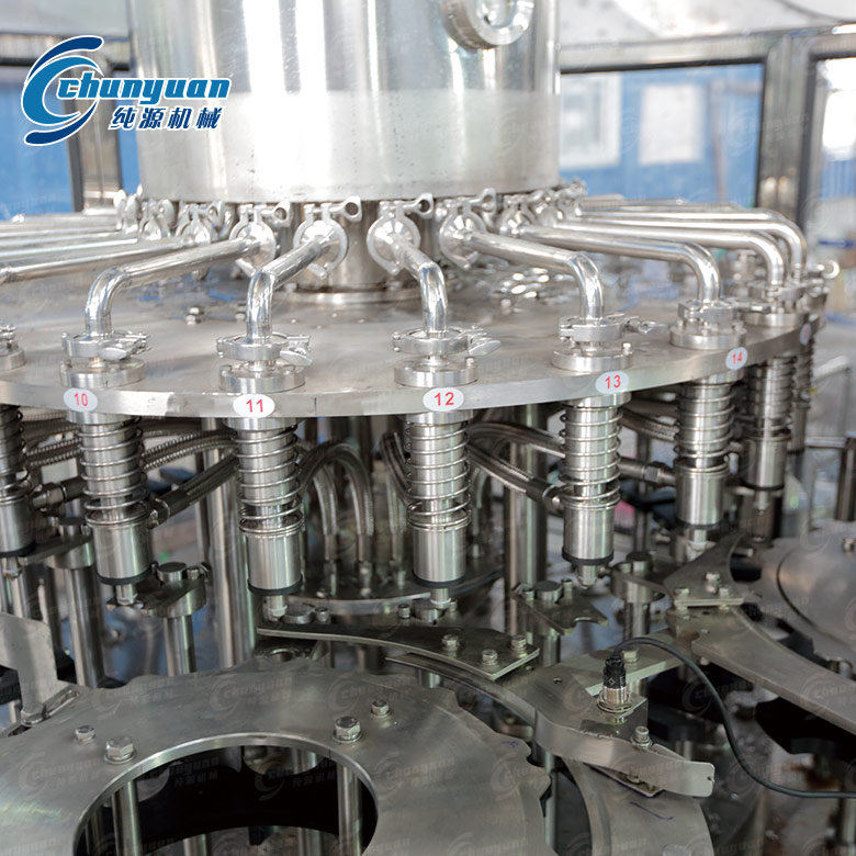 纯源机械厂家供应的全自动冰红茶饮料灌装机械采用卡瓶颈传动技术,实现全自动冲瓶、灌装、旋盖等工序,自动化程度高;配有完善的温度控制系统和回流系统,设有完善的自动清洗系统及控制程序,整个饮料机械与液体接触的零件全部使用优质不锈钢材料及食品级橡胶。