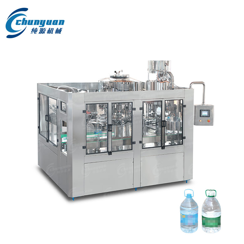 SGF系列3-5L大瓶饮用水灌装设备集冲瓶、灌装、拧盖三部分为一体,是纯源机械结合国外先进的灌装工艺技术,自主研制开发制造,专用于纯净水、矿泉水、饮用水等水灌装。