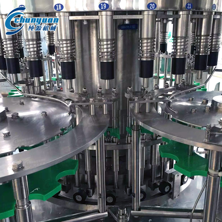 饮用水灌装设备的瓶子由瓶颈托板卡住并在凸轮作用下将瓶子上升,然后由瓶口将灌装阀顶开。灌装采用重力灌装方式。灌装阀打开后物料通过灌装阀完成灌装过程,灌装结束后瓶口下降离开灌装阀,瓶子通过卡瓶颈过渡拨轮进入旋盖机。旋盖机上的止旋刀卡住瓶颈部位,保持瓶子直立并防止旋转。旋盖头在旋盖机上保持公转并自转,在凸轮作用下实现抓盖、套盖、旋盖、脱盖动作,完成整个封盖过程。成品瓶通过出瓶拨轮从旋盖机传送到出瓶输送链上,由输送链传送出三合一水灌装机。
