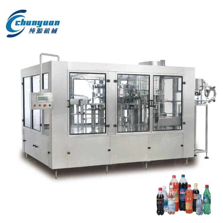 三合一碳酸饮料灌装机适用于PET瓶含气饮料、碳酸饮料的生产。含气饮料机械将冲洗、灌装、旋盖三个功能集于一体,全过程实现自动化,可适用于各种瓶型。饮料机械采用不锈钢材料制成,其具有结构合理、工艺先进、操作方便、适用范围广等特点,是中小型饮料厂家理想的生产流水线机组。