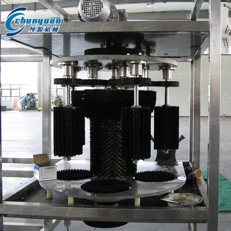 全自动外刷桶机由不锈钢机架、封板(不锈钢〉、主旋转毛刷、毛刷调速电机、拨轮调速电机、捅底部旋转毛刷、拨轮结构、 冲洗水泵、喷淋室等组成。全自动外刷桶机采用优质不锈钢制作,耐腐蚀,易清洗。主要气路原件均采用台湾亚德克产品,该机结构紧凑, 工作效率高且稳定可靠,自动化程度高,操作简单。